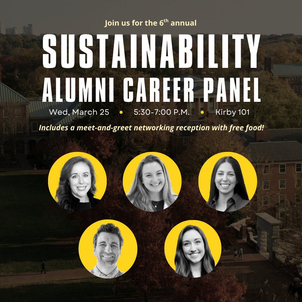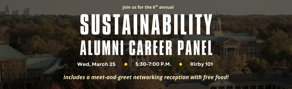 Kirby Hall 101Whether you're looking for guidance on landing a job or simply looking to learn more about your career options, this event will be an informative and fun way to explore your future! We've invited a panel of five Wake Forest graduates to campus for our 6th annual Sustainability … -