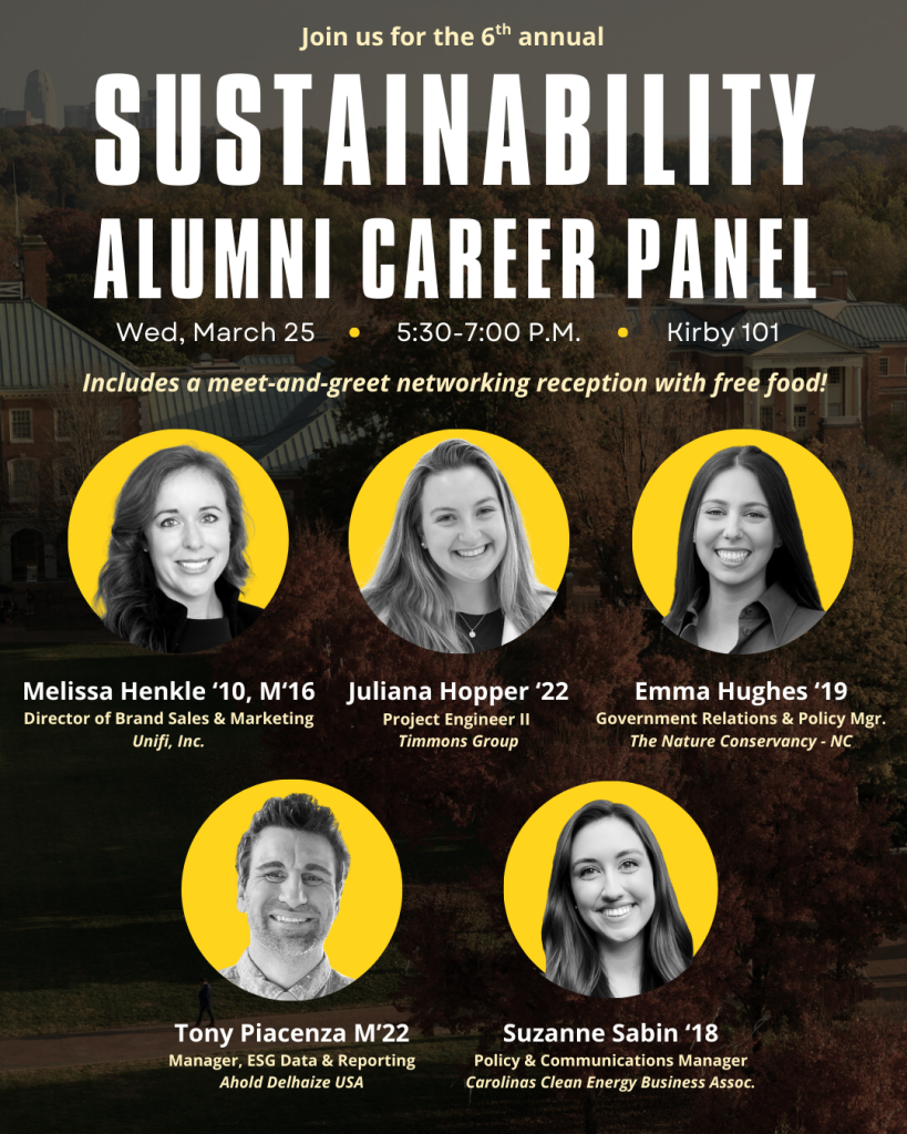 The panelists will talk about their current positions, their career paths, and how you can pursue a successful, impactful, and fulfilling future in a wide array of sustainability-focused positions. Whether you’re looking for guidance on landing a job or simply looking to learn more about your career options, this event will be an informative and fun way to explore your future!