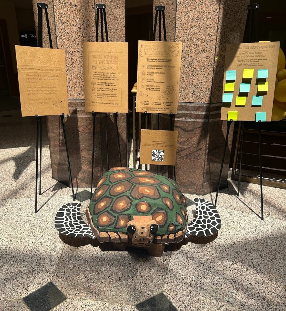 This year, two members of SLG’29 blended plastic waste mitigation and artistic ingenuity—creating an art installation to celebrate Earth Month 2026. The installation, “Where Waste Meets Creativity: From Campus Habits to Global Impacts,” takes the form of an intricate sea turtle named Earlene, who is made entirely of repurposed waste materials like cardboard, paper, and single-use plastics.