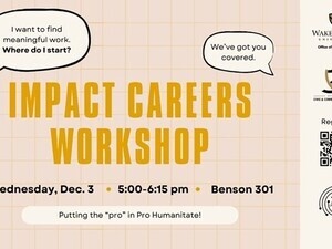 Reynolda HallWant to work towards a rewarding career in sustainability and social impact, but don’t know where to start? Hosted by the Office of Sustainability and the Office of Civic and Community Engagement, this workshop will cover frameworks for career planning and job searching, tips and resources, and the importance of …